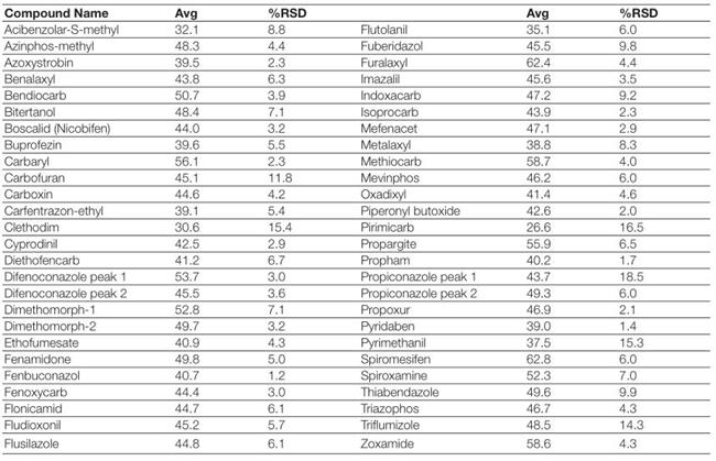 通過對(duì)萵苣樣品進(jìn)行所有600種農(nóng)殘的掃描,最終定量檢測(cè)出52種農(nóng)殘。用Thermo Scientific的TraceFinder軟件繪制曲線,所有化合物的線性相關(guān)系數(shù)R2 > 0.98。對(duì)加入 40 ppb 校準(zhǔn)溶液的基質(zhì)加標(biāo)樣品進(jìn)行了10次平行分析。為了檢驗(yàn)篩查能力,還向40ppb加標(biāo)樣中另外添加了少量校準(zhǔn)溶液未包含的化合物,均被該方法檢出。表2 列舉出了40 ppb 加標(biāo)樣中各化合物的平均濃度和RSD(%)。