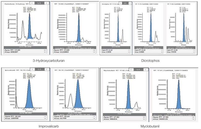 圖 2. 定性檢出的未經(jīng)校準(zhǔn)非目標(biāo)農(nóng)殘。最大的峰為定量峰,其它峰為確認(rèn)峰。