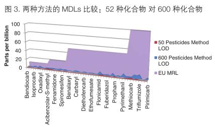 建立了第二種方法,只以52種農(nóng)殘作為目標(biāo)化合物,僅包含104個(gè)離子對(duì)。對(duì)5ppb 和10ppb標(biāo)樣平行分析10次,計(jì)算兩種儀器方法的MDLs,一種包含超過1300個(gè)離子對(duì),另一種僅包含104個(gè)離子對(duì)。圖3顯示了兩種方法的MDLs結(jié)果。盡管包含104個(gè)離子對(duì)的方法能提供更長(zhǎng)的駐留時(shí)間從而得到更低的檢出限,但對(duì)于本實(shí)驗(yàn)化合物清單中歐盟對(duì)萵苣有限值規(guī)定的農(nóng)殘,掃描600種化合物的篩查方法仍然能夠滿足要求。