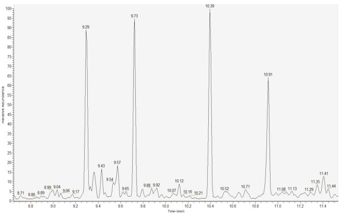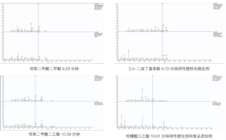 果汁飲料中加入100ppb標(biāo)樣,并采用FS/SRM交替掃描的儀器方法進(jìn)行分析。樣品萃取液中還添加了兩種1ppm水平的酞酸酯。從100ppb農(nóng)殘加標(biāo)樣的全掃描色譜圖中發(fā)現(xiàn)一些明顯的峰,保留時(shí)間為9.29分鐘、9.73分鐘、10.39分鐘、10.91分鐘,和一個(gè)飽和峰,保留時(shí)間在31.00分鐘。圖5為前四種化合物的放大圖,圖6顯示了這些非目標(biāo)化合物在 NIST 圖庫中的匹配情況。