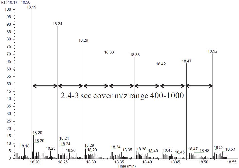圖 2. QE HF 掃描目標(biāo)質(zhì)核比窗口 400–1000 采集 50 張 MS/MS 所需時(shí)間在 2.4–3 s