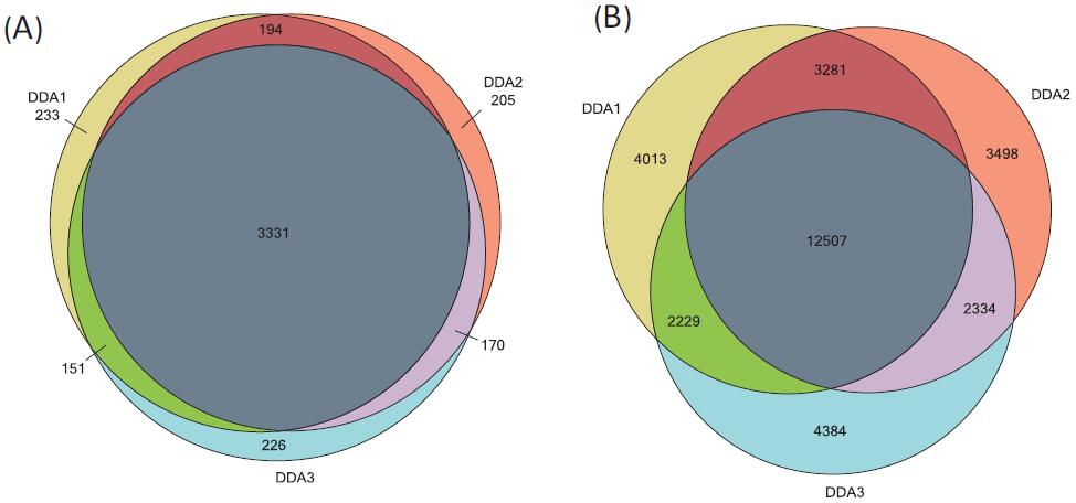 圖 3. 500 ng Hela 細(xì)胞裂解液 3 次 DDA 鑒定結(jié)果(A)鑒定到的蛋白交蓋圖(B)鑒定到的肽段的交蓋圖