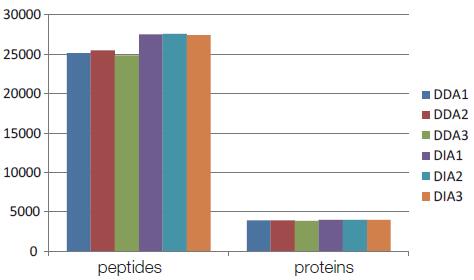 圖 4. 3 次 DDA 實(shí)驗(yàn)和 3 次 DIA 實(shí)驗(yàn)定量到的肽段和蛋白