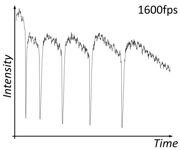 在上圖中,肉眼是看不到神經(jīng)元胞體因膜電位變化而產(chǎn)生的熒光信號變化的;但是在高速成像下經(jīng)過對圖片灰度的時間分析,就能看到1ms時間尺度內(nèi)熒光的快速變化了。