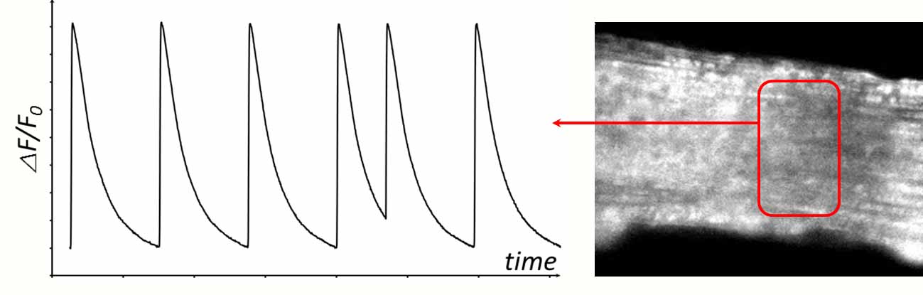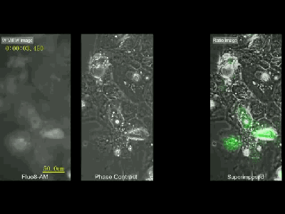 另外一些肉眼可以觀察到的變化,通過高速成像則能夠更好的研究其信號隨時間的變化過程。例如鈣離子熒光染料或熒光蛋白(fluo-4、gcamp等),其熒光強(qiáng)度會隨鈣離子濃度的升高而升高。