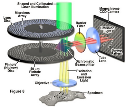 2、spinning disk共聚焦作為一種很成熟的共聚焦成像手段,能夠提供點(diǎn)掃描共聚焦無法比擬的高速成像能力。這一高速成像能力除了要?dú)w功于nipkow轉(zhuǎn)盤帶來的多針孔外,還需要scmos的高速拍攝性能相配合,從而在video-rate下得到與點(diǎn)掃描共聚焦相當(dāng)?shù)母叻直鎴D片。