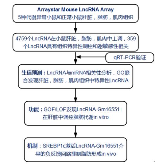 美國國立衛(wèi)生研究院曹海明教授主要研究能量代謝的復(fù)雜調(diào)控機(jī)制,揭示代謝性疾病的發(fā)病機(jī)制。其團(tuán)隊(duì)在解析lncRNA在小鼠代謝性疾病領(lǐng)域的調(diào)控過程取得了一系列突破性發(fā)現(xiàn)。近期,該實(shí)驗(yàn)室采用Arraystar Mouse LncRNA 芯片研究病理代謝條件下小鼠的關(guān)鍵代謝器官中的mRNA和LncRNA,篩選出小鼠不同代謝狀況下的組織特異性lncRNA。通過過表達(dá)和敲除lncRNA-Gm16551,闡明了lncRNA-Gm16551是代謝轉(zhuǎn)錄因子SREBP1c和脂肪生成等的負(fù)調(diào)控因子。該研究成果發(fā)表在細(xì)胞代謝領(lǐng)域權(quán)威期刊Cell Metabolism(影響因子17.56)。(芯片實(shí)驗(yàn)由Arraystar提供技術(shù)服務(wù))