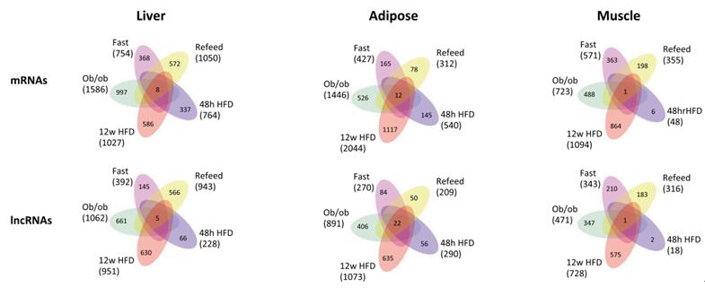 圖A:小鼠不同代謝條件下組織特異性mRNA(上圖)和lncRNA(下圖)在肝臟(左)、脂肪(中)和肌肉(右)分布圖