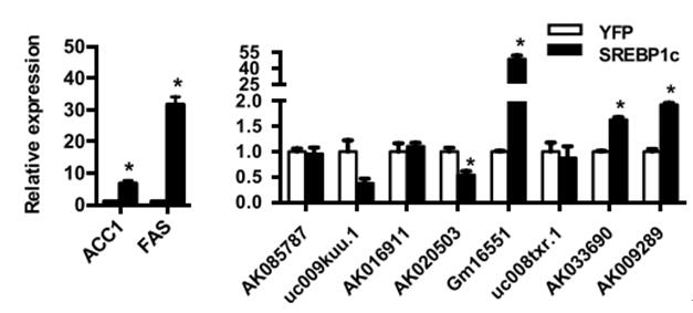 圖C:肝臟組織中過表達(dá)代謝轉(zhuǎn)錄因子SREBP1c 24h后,LncRNA的表達(dá)水平變化