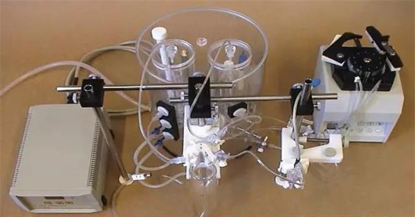 內(nèi)循環(huán)的目的就是給心臟灌注恒溫KH液。具體工作流程是:灌注液槽注入K-H液,并通入混合氣,然后通過“蠕動泵”蠕動帶出,返回水槽中的蛇形管保溫,再通過蛇形管進入主動脈插管。內(nèi)外循環(huán)就構(gòu)成了灌流工作原理。