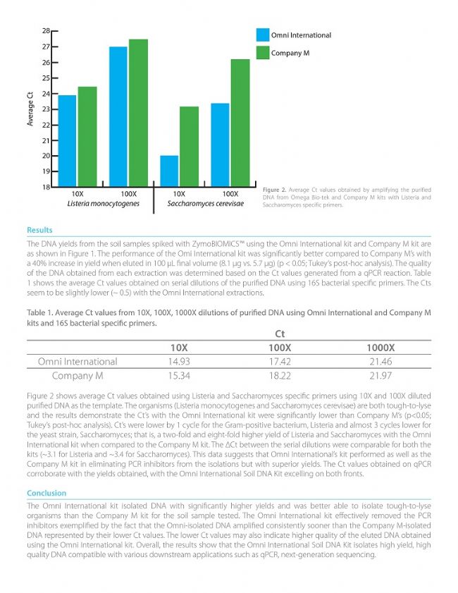 圖2顯示了使用10X和100X稀釋純化DNA作為模板的利斯特氏菌和酵母特異性引物獲得的平均Ct值。生物體(利斯特氏菌(Listeria monocytogenes)和釀酒酵母(Saccharomyces cerevisae))都是難以理解的,結(jié)果表明,Omni International試劑盒的Ct顯著低于M公司(p <0.05; Tukey的事后分析)。對(duì)于革蘭氏陽(yáng)性菌,李斯特菌,Ct降低1個(gè)循環(huán),酵母菌株Saccharomyces降低近3個(gè)周期;也就是說(shuō),與M公司相比,使用Omni International試劑盒的利斯特氏菌和酵母菌的產(chǎn)量是兩倍和八倍。連續(xù)稀釋度之間的ΔCt對(duì)于兩種試劑盒(對(duì)于利斯特氏菌為〜3.1,對(duì)于酵母菌為〜3.4)是相當(dāng)?shù)。該?shù)據(jù)表明,Omni International的試劑盒以及公司M試劑盒在隔離中消除PCR抑制劑但具有優(yōu)異的產(chǎn)量。在qPCR上獲得的Ct值證實(shí)了所獲得的產(chǎn)量,Omni International Soil DNA Kit在兩個(gè)方面均表現(xiàn)優(yōu)異。