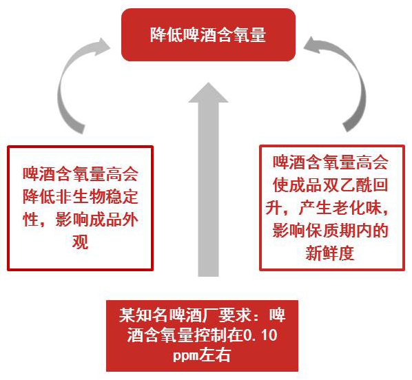 通常啤酒釀造過程中,溶解氧含量應(yīng)控制在0.10ppm左右。成品酒中吸入過多的氧會(huì)造成瓶裝熟啤香氣和口味較大改變,啤酒中酒花芳香氣味會(huì)消失,并產(chǎn)生氧化臭味。啤酒中不飽和脂肪酸的氧化產(chǎn)生紙板味,同時(shí)啤酒中的蛋白多肽類物質(zhì)氧化也可能形成渾濁物,甚至造成永久渾濁。由此可知,控制啤酒中含氧量是非常重要的一個(gè)環(huán)節(jié)。