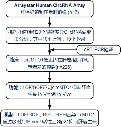 本研究運用Arraystar CircRNA 芯片研究肝癌組織中的表達和功能。發(fā)現(xiàn)circMTO1的表達在HCC組中顯著降低,并且與HCC病人差的預后相關。功能和機制研究發(fā)現(xiàn),circMTO1通過海綿吸附miR-9,上調(diào)p21的表達抑制HCC的生長,意味著circMTO1在HCC的發(fā)育過程中起著抑癌基因的作用。進一步說,體內(nèi)干預circMTO1實驗表明circMTO1有HCC靶向治療的潛力。結(jié)果表明circMTO1或可作為預后的診斷標志物和HCC治療的靶標。