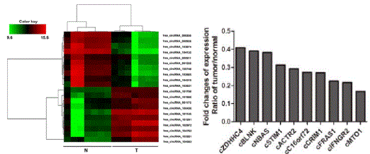 圖1:挑選肝癌中20個差異顯著的CircRNA做聚類分析;qPCR驗證circMTO1芯片結(jié)果和qPCR結(jié)果一致。