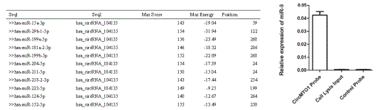 圖2:通過Miranda預測circRNA能結(jié)合99個microRNA;FISH驗證生物信息學預測結(jié)果