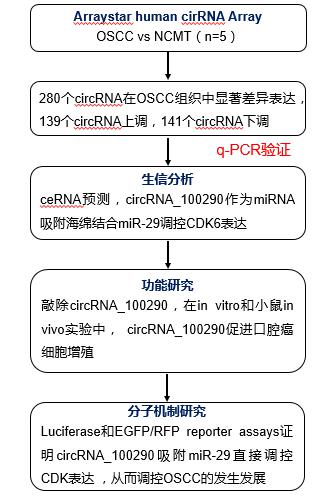 中南大學湘雅二醫(yī)院陳林老師長期從事口腔癌的發(fā)生發(fā)展機制及治療。近期,其實驗室通過Arraystar circRNA芯片發(fā)現(xiàn)一種調(diào)控口腔鱗狀細胞癌發(fā)生發(fā)展的circRNA分子—circRNA_100290。CircRNA_100290通過內(nèi)源競爭結(jié)合miR-29,從而解除miR-29對CDK6的抑制,促進口腔鱗狀細胞癌的發(fā)生發(fā)展。該成果發(fā)表在Nature子刊Oncogene(IF=7.932)。(芯片由康成生物提供技術(shù)服務(wù))。