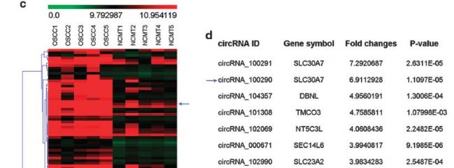 為了探究circRNA在OSCC發(fā)生和發(fā)展的作用,本文使用Arraystar circRNA芯片,分析OSCC及NCMT樣本,分析circRNA表達譜,發(fā)現(xiàn)共有280個circRNA表達發(fā)生顯著表達,其中139個circRNA上調(diào),141個circRNA下調(diào),從上調(diào)最顯著的10個circRNA中選出circRNA_100290, q-PCR驗證circRNA_100290確實在OSCC組織中表達顯著上調(diào)。