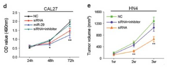 已經(jīng)報道的circRNA多是通過ceRNA機制發(fā)揮功能,作者更深一步挖掘circRNA_100290的分子機制,通過miRNA數(shù)據(jù)庫:Targetscan、miRanda和RNA22,預(yù)測circRNA_100290靶基因, 得到評分最高的3個microRNA:miR-29b-3p,miR-29c-3p,miR-29a-3p及最可能相關(guān)的靶基因CDK6,該基因是細胞周期相關(guān)蛋白,且在表達譜芯片中顯著上調(diào)。作者通過敲低OSCC細胞系circRNA_100290的表達,發(fā)現(xiàn)這些細胞中CDK6表達也顯著下調(diào),證明CDK6的表達受到circRNA_100290的調(diào)控。CDK6在細胞周期中有非常重要的作用,能促進細胞進入DNA合成的S期,通過MTT和BrdU實驗證明,敲除circRNA_100290,或者使用miR-29的類似物,都能顯著降低CAL27細胞的增殖。作者同時在in vivo水平進行了驗證,將正常HN4細胞和circRNA_100290敲除的HN4細胞植入小鼠體內(nèi),3周后檢測發(fā)現(xiàn),未經(jīng)敲除的小鼠體內(nèi)腫瘤體積的增加量多于circRNA_100290敲除的小鼠,通過熒光素酶實驗證明miR-29能在細胞內(nèi)直接結(jié)合circRNA_100290和CDK6。