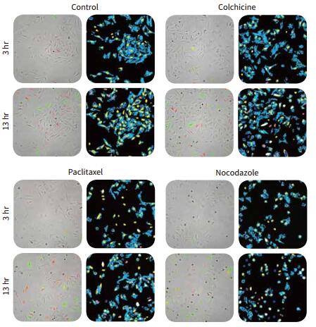 監(jiān)測對細(xì)胞周期變化的影響對于腫瘤的發(fā)展及藥物研發(fā)有著重要的作用。例如,已知抑制有絲分裂的化合物大都用來減緩腫瘤細(xì)胞的生長。活細(xì)胞高內(nèi)涵的篩選已被驗證可以區(qū)分細(xì)胞的每個周期。此技術(shù)結(jié)合BacMam轉(zhuǎn)染系統(tǒng),可使細(xì)胞表達(dá)兩種細(xì)胞周期相關(guān)熒光融合蛋白。