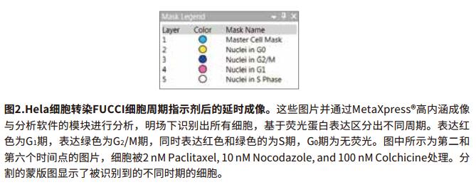活細(xì)胞使用FUCCI細(xì)胞周期指示劑,化合物處理后細(xì)胞周期的變化可以被實時監(jiān)測到,比終點(diǎn)法檢測固定細(xì)胞能得到更多的信息。轉(zhuǎn)染了FUCCI細(xì)胞周期指示劑的Hela細(xì)胞在高內(nèi)涵細(xì)胞中實時拍攝了圖像,并通過MetaXpress®高內(nèi)涵成像與分析軟件的模塊進(jìn)行分析,明場下識別出所有細(xì)胞,基于熒光蛋白表達(dá)區(qū)分出不同周期。表達(dá)紅色為G 1期,表達(dá)綠色為G 2/M期,同時表達(dá)紅色和綠色的為S期(圖2)。處于G0期的細(xì)胞沒有熒光信號,但是會在明場下被識別到并計入細(xì)胞總數(shù)中。另外,分裂的細(xì)胞也可被記錄。