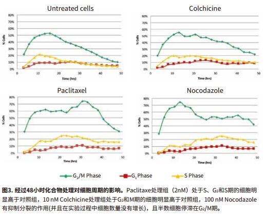 分析過程可使用MetaXpressPowerCore并行處理軟件加速分析速度。經(jīng)過24小時化合物處理,大部分細(xì)胞停留在G0期,只有少數(shù)細(xì)胞表達(dá)了細(xì)胞周期標(biāo)記蛋白。被紫杉醇和諾考達(dá)唑的細(xì)胞有一定的細(xì)胞停滯在G2/M期(圖3)。