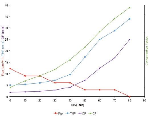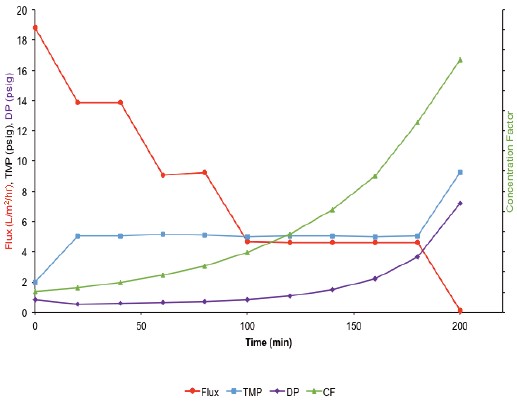如圖1所示,濃縮開始后,TMP立即開始增加。同時(shí),通量開始穩(wěn)定下降。組件兩端的壓力降(DP)可作為膜污染的指示,通常是涉及濃縮步驟的工藝的困擾。但是,圖1顯示,即使在工藝開始60min后,壓力降維持在10psig以下。60min之后,壓力降開始增加超過10psig,最終達(dá)到約25psig,通量降至0L/m2/hr。
