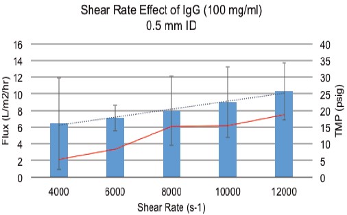 如圖5所示,增加背壓對(duì)濾液通量會(huì)有負(fù)作用,使用含0.5mm內(nèi)徑纖維過濾組件,剪切率為6,000S-1時(shí),通量從14L/m2/hr降低至9L/m2/hr。這說明提高背壓會(huì)增加凝膠層的形成,最終降低過濾器性能。有意思的是,當(dāng)剪切率增加至10,000S-1,且TMP恢復(fù)至5psig,濾液通量增加至18L/m2/hr,這說明增加的流速可從膜表面清掃并去除沉降的IgG。此外,將TMP增加至10、15和20psig,對(duì)濾液通量不會(huì)有不利的影響,說明在10,000S-1下,增加的剪切率可有效且連續(xù)地沖掃膜表面。而即使在較高的TMP條件下,這種沖掃作用防止了凝膠層的形成。