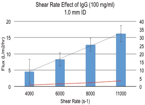 本應(yīng)用測(cè)試了使用HF膜進(jìn)行IgG有效濃縮的可行性,并分析了剪切率和跨膜壓(TMP)對(duì)濾液通量的影響。