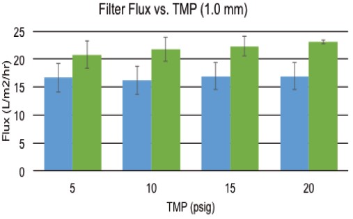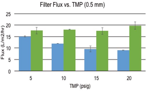 在我們最后的實(shí)驗(yàn)中,我們測(cè)試了在給定剪切率條件下,施加背壓對(duì)過濾器性能的影響。在此實(shí)驗(yàn)中,在6,000和10,000S-1剪切率條件下,對(duì)含有0.5和1.0mm內(nèi)徑纖維的過濾器組件進(jìn)行測(cè)試,而TMP從5增加至20psig。結(jié)果如圖5和圖6所示。實(shí)驗(yàn)使用30mg/mL IgG溶液(0.9%鹽溶液)進(jìn)行。