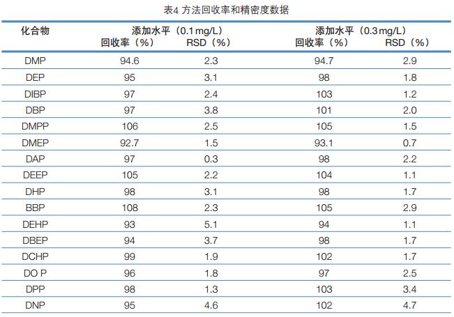 配制系列濃度0.10、 0.20、 0.40、 0.80、 1.00、2.00、 4.00 mg/L的混合標準溶液,由低濃度至高濃度依次進樣檢測,以質(zhì)量濃度與峰面積作標準曲線線性回歸。結(jié)果表明,在0.10~4.00 mg/L范圍內(nèi)15種鄰苯二甲酸酯類物質(zhì)具有良好線性關(guān)系。 DNP響應較差,線性范圍為0.40~4.00 mg/L。采用樣品添加目標化合物的方法,依據(jù)特征離子質(zhì)量色譜峰信噪比R S/N=3計算方法檢出限,R S/N=10計算方法定量限,結(jié)果見表3。