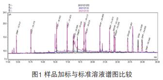 按上述前處理方法測定了7個塑料瓶裝飲料樣品中的鄰苯二甲酸酯類物質(zhì)殘留量,測定結(jié)果見表5。標準品、樣品添加譜圖見圖1。