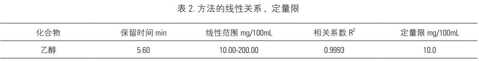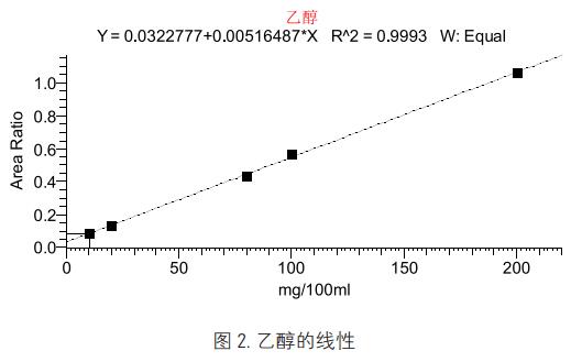 取2.2項(xiàng)下的系列濃度標(biāo)準(zhǔn)溶液0.5mL,分別加入0.1mL的叔丁醇內(nèi)標(biāo)液,密封后混勻進(jìn)樣。由低濃度至高濃度依次進(jìn)樣檢測,以乙醇峰面積和內(nèi)標(biāo)叔丁醇峰面積比為縱坐標(biāo),乙醇濃度為橫坐標(biāo)作標(biāo)準(zhǔn)曲線線性回歸。結(jié)果表明,目標(biāo)物乙醇和內(nèi)標(biāo)叔丁醇峰形良好(圖1),在10mg/100mL~200mg/100mL范圍內(nèi)乙醇呈良好線性關(guān)系(R2=0.9993,見圖2)。