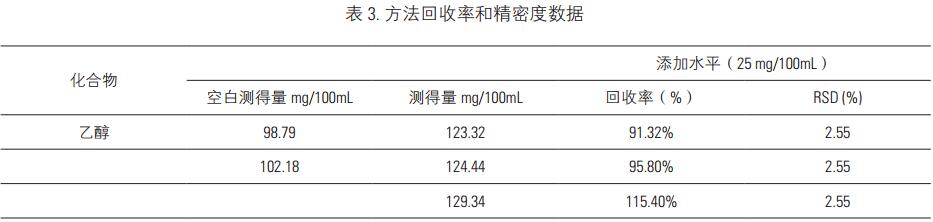 按照2.3項(xiàng)下方法制備3份加標(biāo)樣品,密封后混勻進(jìn)樣,所得樣品圖見圖3,結(jié)果見表2,回收率范圍為91.32~115.40%,相對標(biāo)準(zhǔn)偏差(RSD,n=3)為2.55%;厥章屎途芏葦(shù)據(jù)結(jié)果見表3。