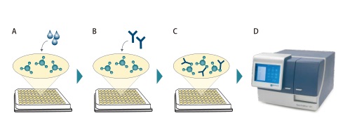 圖 3 ValitaTITER 實(shí)驗(yàn)流程。(A) ValitaMab 重組緩沖液加入到 ValitaTITER 板的每個孔中。(B) 樣品或 IgG 標(biāo)準(zhǔn)品加入到孔中。(C) 孔板孵育 30 分鐘為結(jié)合的發(fā)生。(D) 使用 SoftMax Pro 軟件在SpectraMax iD5 讀板機(jī)上檢測 FP