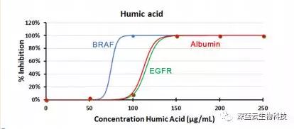 多重Crystal dPCR反應(yīng)中含有PerfeCta Multiplex qPCR Toughmix,ALB基因的引物和探針(Cy-5標(biāo)記),EGFR基因的引物和探針(HEX標(biāo)記)和BRAF的引物和探針(FAM標(biāo)記),并且使用相同量的人類(lèi)基因組DNA摻入不同濃度的腐殖酸(利用Sigmoid即S型函數(shù)擬合)。以不添加抑制劑的DNA定量為0%抑制,計(jì)算抑制百分比。