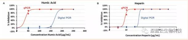 圖3. 不同濃度的腐殖酸(A)和肝素(B)對(duì)qPCR和Crystal dPCR的抑制。