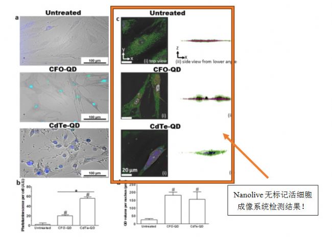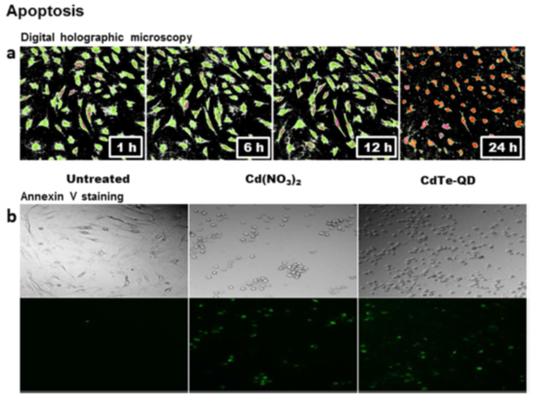 量子點(diǎn)(quantum dot,QDs)是一種具有優(yōu)越的熒光特性的半導(dǎo)體納米晶體,在細(xì)胞和組織的熒光標(biāo)記方面有著出色的表現(xiàn),也可以應(yīng)用于細(xì)胞死亡的表征。近日,法國(guó)科學(xué)家借助Nanolive無(wú)標(biāo)記活細(xì)胞成像系統(tǒng)在Scientific Reports雜志上發(fā)表了有關(guān)碲化鎘量子點(diǎn)(CdTe-QDs)表征細(xì)胞死亡機(jī)制的文獻(xiàn)。