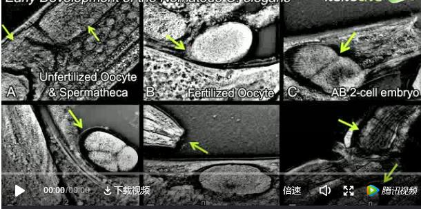 視頻中展示了3D cell Explorer對秀麗隱桿線蟲早期發(fā)育不同階段實時標(biāo)記斷層3D掃描過程:A.子宮中的未受精卵細(xì)胞(右邊的綠色箭頭)和精子(左邊的綠色箭頭);C.胚胎期AB:兩個細(xì)胞之間的隔膜用綠色箭頭標(biāo)記;D.胚胎期AB2:胚胎由4個細(xì)胞組成。卵殼清晰可見,用綠色箭頭表示;E.胚胎期ABn:胚胎由許多(n)細(xì)胞組成。在視野里也可以看到母體的嘴,如綠色箭頭所示;F.這種蠕蟲的子宮里有兩種不同的胚胎以不同的速度發(fā)育:底部的AB2和頂部的ABn。