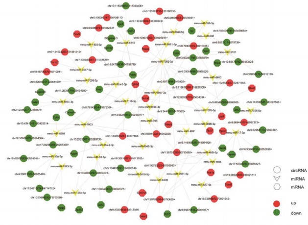 海綿機(jī)制預(yù)測(cè)ceRNA網(wǎng)絡(luò)圖。按照海綿機(jī)制的反式調(diào)控方式,該網(wǎng)絡(luò)中包括42個(gè)上調(diào)和48個(gè)下調(diào)的環(huán)狀RNA分子,以及預(yù)測(cè)相互結(jié)合的22個(gè)靶基因mRNA。