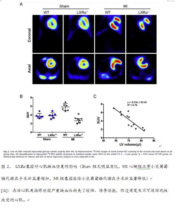 實(shí)驗(yàn)結(jié)果顯示,所有LXRα基因敲除小鼠相對(duì)于對(duì)照組小鼠表現(xiàn)了更大的心梗范圍;利用SUV分析在兩組小鼠在心梗部分心肌中的葡萄糖攝取情況,發(fā)現(xiàn)LXRα基因敲除小鼠的左心室心肌對(duì)葡萄糖的攝取率,明顯低于對(duì)照組小鼠;比較LXRα基因敲除小鼠和對(duì)照組小鼠自身的心梗區(qū)和非心梗區(qū),也顯示了同樣的SUV結(jié)果。這表明LXRα基因?qū)O大的影響葡萄糖在缺血性心肌中的獲取。