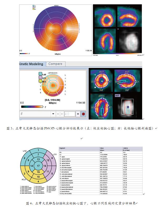 目前已有廣泛的示蹤劑可用于心臟研究。實(shí)際應(yīng)用時(shí),研究者可根據(jù)采用的示蹤劑和研究流程,結(jié)合小動(dòng)物PET/CT提供的動(dòng)態(tài)采集功能,通過(guò)示蹤劑攝取、以及對(duì)組織灌注和葡萄糖消耗,可實(shí)現(xiàn)量化的分析,獲得心臟組織的綜合信息。