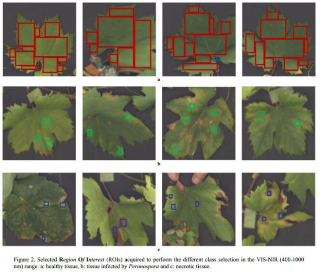 Fig.2給出了在VIS-NIR范圍(400-1000 nm)獲得的每個(gè)參考類(lèi)別的葉子(即健康的、受感染的和壞死的)所選擇的區(qū)域的示例, NIR范圍(1000-1700 nm)所選擇的區(qū)域如Fig.3所示。