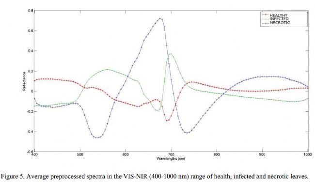 圖:在健康、感染和壞死葉片的VIS-NIR (400-1000 nm)范圍內(nèi)的預(yù)處理光譜