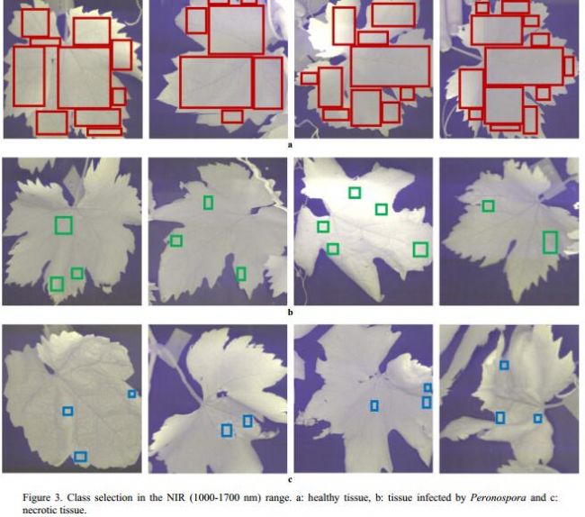 圖:在NIR(1000-1700 nm)范圍內(nèi)進(jìn)行等級(jí)選擇。a:健康組織,b:霜霉病感染組織,c:壞死組織。