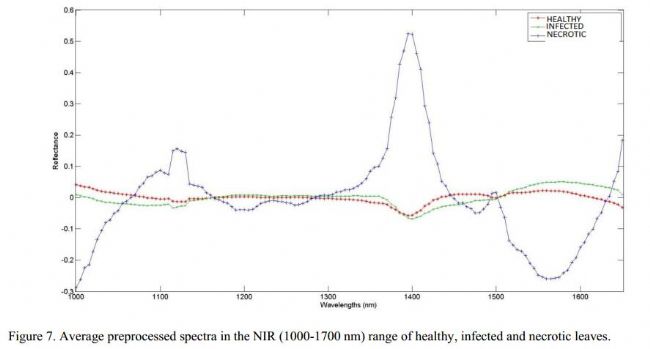 圖:健康、受感染和壞死葉片的NIR(1000-1700 nm)平均預(yù)處理光譜