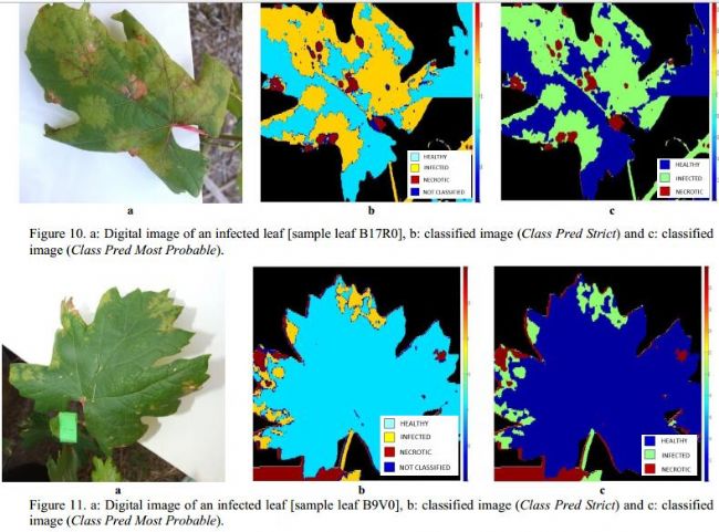 意大利科學(xué)家S. Serranti在一個(gè)試驗(yàn)中使用兩款Specim高光譜成像設(shè)備:Specim Imspector V10 和Specim Spectral Camera N17,利用偏最小二乘判別分析(PLS-DA)模型對(duì)健康葉片和不同程度感染霜霉病的葡萄進(jìn)行了區(qū)分,以識(shí)別葡萄葉片中由于霜霉病病理的存在而導(dǎo)致的不同程度的癥狀。