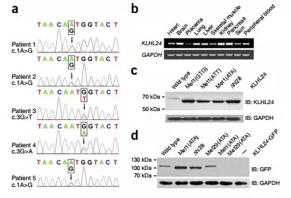 Fig.1 KLHL24 start-codon mutations identified in the five patients result in an N-terminally truncated protein.(a) Sequence chromatograms showing heterozygous c.1A>G (patients 1, 2 and 5), c.3G>T (patient 3) and c.3G>A (patient 4) mutations, affecting the start codon.(b) Expression profile of human KLHL24 determined by RT–PCR, showing ubiquitous expression in representative adult tissues, including skin. (c) Expression of KLHL24 protein analyzed by immunoblotting in 293T cells transfected with the indicated constructs. (d) Expression of KLHL24 proteins analyzed by immunoblotting in 293T cells transfected with the indicated C-terminally GFP-tagged constructs and untransfected cells (–).