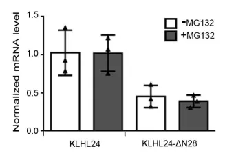 將KLHL24與KLHL24-∆N28在HaCaT(永生化人類(lèi)角質(zhì)細(xì)胞系)細(xì)胞中過(guò)量表達(dá),發(fā)現(xiàn)KLHL24-∆N28的表達(dá)量遠(yuǎn)遠(yuǎn)高于正常型KLHL24 (Fig. 2a). 猜測(cè)可能是由于蛋白質(zhì)的穩(wěn)定性不同導(dǎo)致,因?yàn)閙RNA水平與這種蛋白表達(dá)量的差異表現(xiàn)無(wú)關(guān)( Fig. 3)。