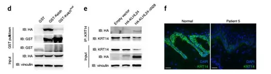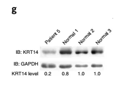 首先測(cè)定KRT14蛋白含量,結(jié)果表明2位患者皮膚樣品中的KRT14含量明顯低于年齡相當(dāng)?shù)姆腔疾?duì)照組(Fig. 4f,g)。同時(shí),與KRT14形成異二聚體的Keratin 5 (KRT5)含量也較對(duì)照組低,但keratin 1 (KRT1)含量沒(méi)有發(fā)生變化(不與KRT14或 KRT5形成二聚體)。