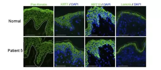 角蛋白免疫熒光及皮膚分化標(biāo)志物表明,患者基底層細(xì)胞中角蛋白大量減少,但基底上層角蛋白及分化標(biāo)志物豐度保持不變(Fig.5)